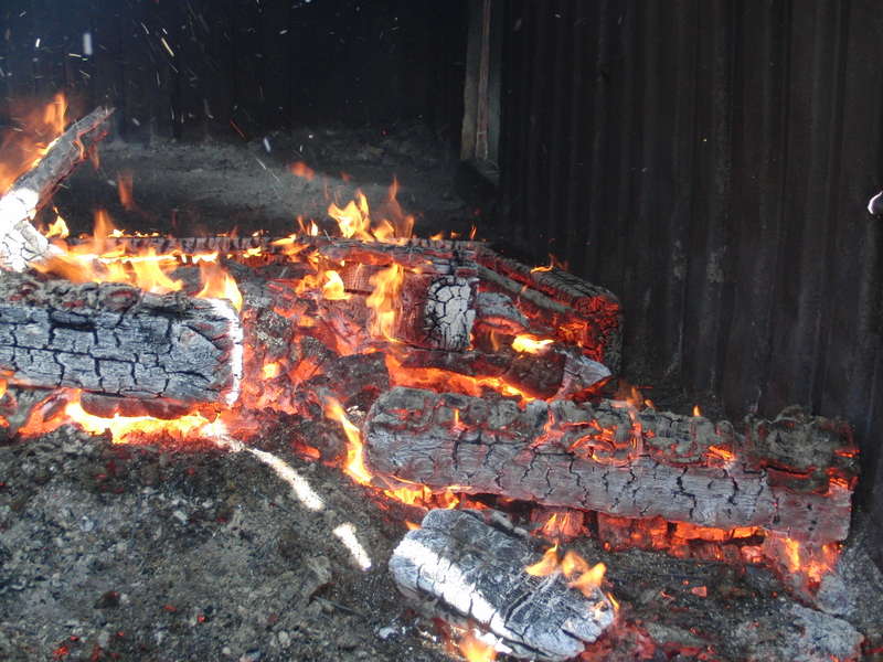 Blick auf das Feuer im Brandraum. Das Foto ist durch ein Loch im Container aufgenommen worden - eine Kamera mit in die Anlage zu nehmen würde dem Gerät sicher nicht bekommen.Nach der ersten Begegnung mit der vollen Hitze folgt ein weiterer Rundgang durch die Strecke. Diesmal ohne Feuerlöscher, dafür aber mit mehr Tempo. Zwischendurch fragt die Atemschutzüberwachung den niedrigsten Flaschendruck ab, dann geht es weiter. Am Ende wartet noch einmal der Brandraum. Über ein bereitliegendes Hohlstrahlrohr gibt der Ausbilder kurz Wasser ab. Das Feuer - davon kaum beeindruckt - brennt scheinbar