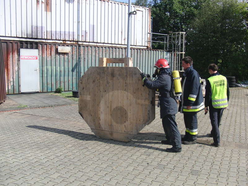 Einer der Trupps in voller Montur. Die Feuerwehr Köln hält spezielle Ausrüstung für die Wärmegewöhnung vor.Der Durchgang durch die Wärmegewöhnungsanlage gestaltet sich überraschenderweise viel aktiver als vermutet. Die Feuerwehr Köln hat nicht nur mehrere Seecontainer gestapelt, sondern gleich ein paar Attraktionen eingebaut. Jeder Kursteilnehmer transportiert einen Feuerlöscher durch die Anlage, quetscht sich durch zwei Wände aus Reifen und ertastet vorsichtig – teilweise ohne Sicht – eventuelle Bodenhindernisse. Bei allen Aufgaben wird natürlich im Trupp gearbeitet, gegenseitige Unterstützung macht vieles einfacher. Zwischendurch weist der Ausbilder auf die Wirkung der Hitze hin, der Temperaturanstieg vom Boden bis in Stehhöhe wird deutlich. Irgendwann taucht eine Treppe aus dem Rauch auf, die in das „Obergeschoss“ der Anlage führt. Dort oben ist die Wärmeeinwirkung schon grenzwertig, während man noch kniet - in aufrechter Position kann man nicht lange verharren.