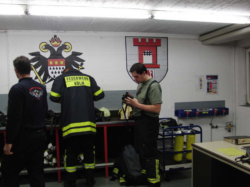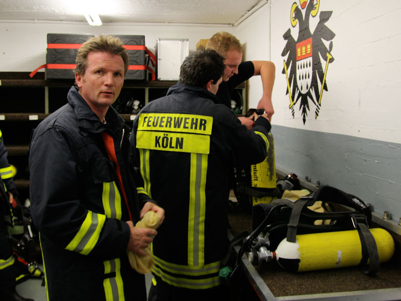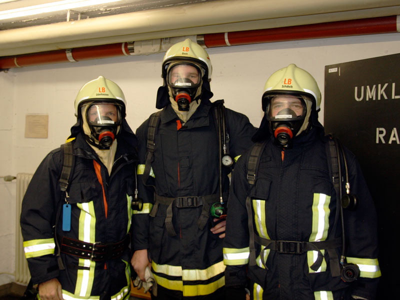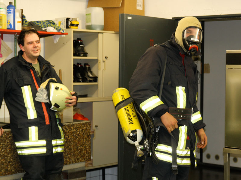 Atemschutzübungsstrecke der Feuerwache 6 in Chorweiler bietet die Übungsstrecke in Porz deutlich mehr Realitätsnähe. Engere (und vor allem flachere) Gänge, teils wirklich schmale Passagen in der Strecke und längere Laufwege zwischen den Stationen werten die schon etwas in die Jahre gekommene Installation deutlich auf. Auch der Boden in der Übungsstrecke der Feuerwache 7 fordert mehr Leistung ab. Kann man in Chorweiler gemütlich auf Kunststoffplatten durch die Gänge rutschen, muss man hier gegen den Reibungswiderstand des Betonbodens angehen – so gewinnt auch das lästige Pflichtprogramm an Wert.Das Ergebnis: Wir sind fit.