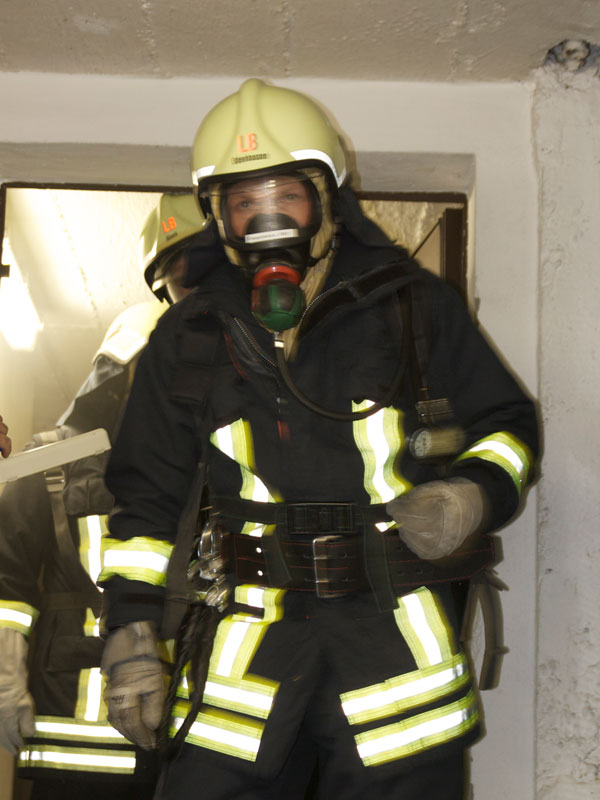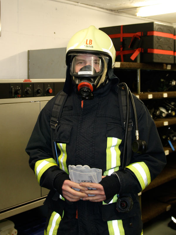 Die volle Montur: Feuerwehr-Schutzkleidung inklusive Gurt, Helm und Handschuhe, dazu 16 Kilogramm Pressluftatmer auf dem Rücken.