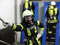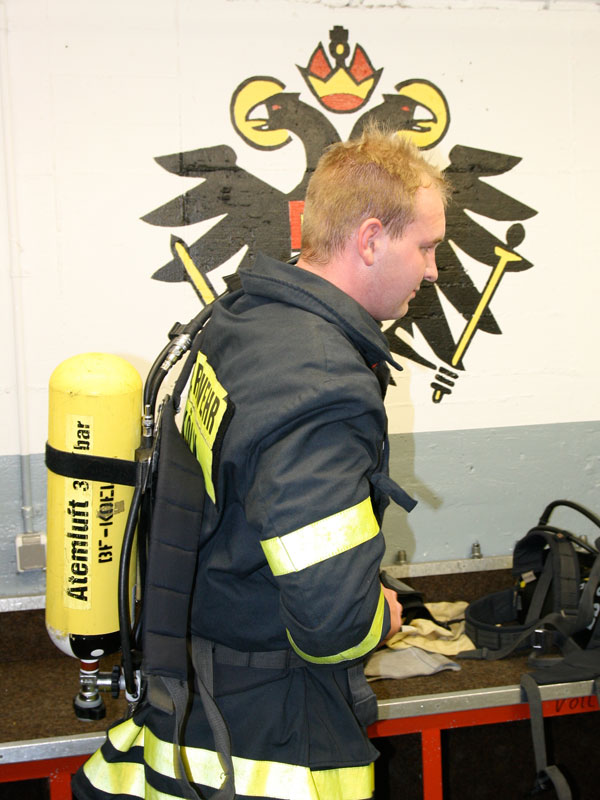Die volle Montur: Feuerwehr-Schutzkleidung inklusive Gurt, Helm und Handschuhe, dazu 16 Kilogramm Pressluftatmer auf dem Rücken.Auf