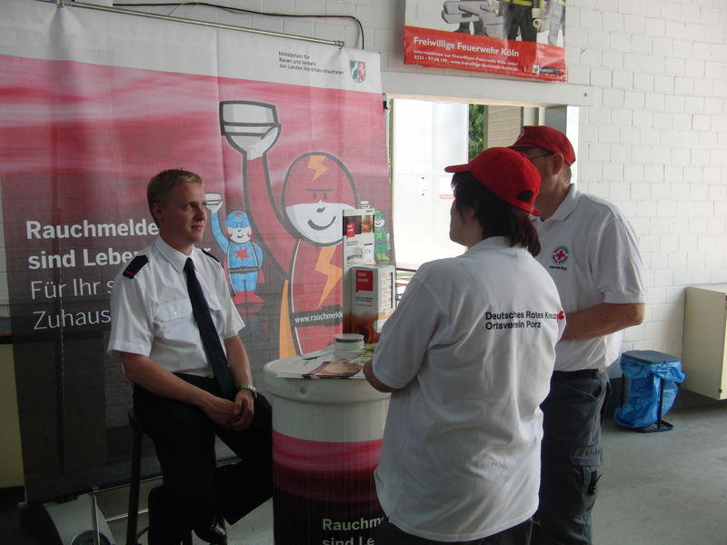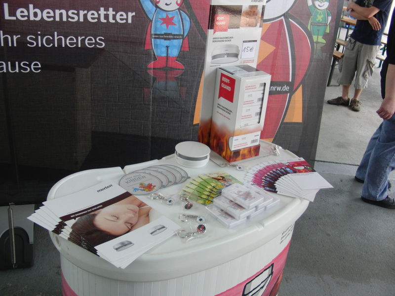 Bei bestem Wetter dauerte es nicht lange, bis der Platz voll war. Von Anfang an war auch unser Info-Stand für Rauchmelder ständig von neugierigen Gästen bevölkert. Viele Familien mit Kindern nahmen dabei auch einen der Kinderfinder-Aufkleber mit, die von der Arbeitsgemeinschaft Kölner Wohnungsunternehmen in Abstimmung mit der Kölner Berufsfeuerwehr entwickelt wurden. Diese Aufkleber sollen, aufgeklebt auf die Türen von Kinderzimmern, besonders auf die kleinen Bewohner aufmerksam machen, wenn die Feuerwehr zur Brandbekämpfung anrückt. An dieser Stelle möchten wir uns daher auch bei der Arbeitsgemeinschaft Kölner Wohnungsunternehmen bedanken, die uns mit diesen Aufkleber versorgt hat. Falls Sie noch Bedarf an einem solchen Kinderfinder-Aufkleber haben sollten, sprechen Sie uns ruhig an – ein paar Exemplare haben wir noch abzugeben.