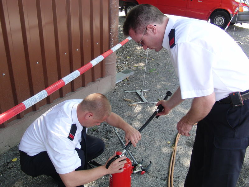 Wer Mut hatte, nahm an unserem Tag der offenen Tür auch selbst den Kampf gegen die Flammen auf, indem er an einer Übungsanlage für Feuerlöscher den Ernstfall probte. Thomas Reiter, unser stellvertretender Löschgruppenführer, gab noch einige Tipps mit auf den Weg, bevor zum Löscher gegriffen wurde. Auch wenn es nur ein kontrolliertes Feuer war, so fühlten sich die Probanden hinterher gut informiert und besser vorbereitet.