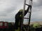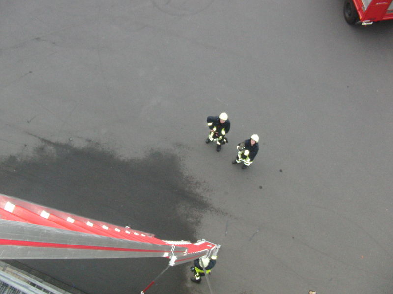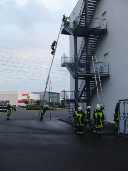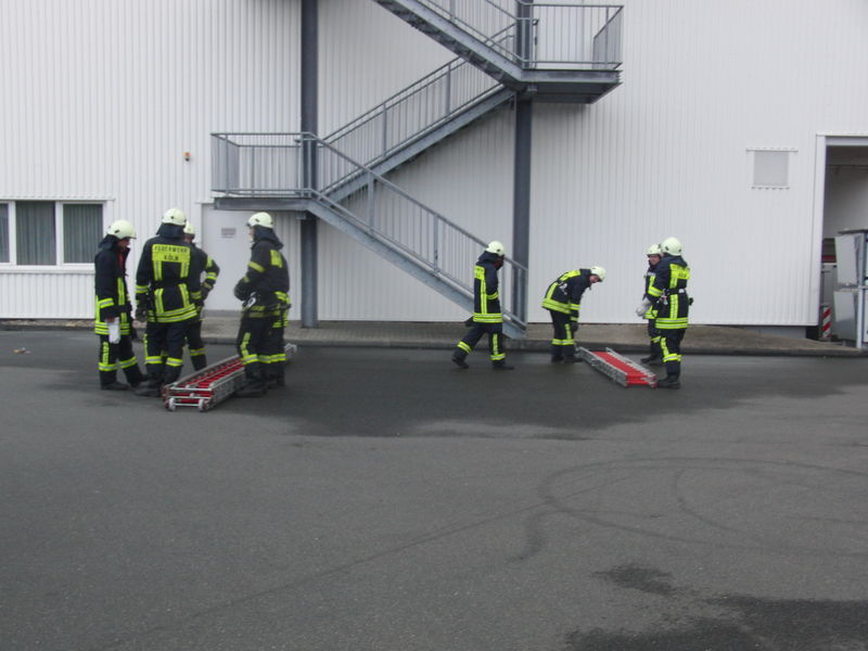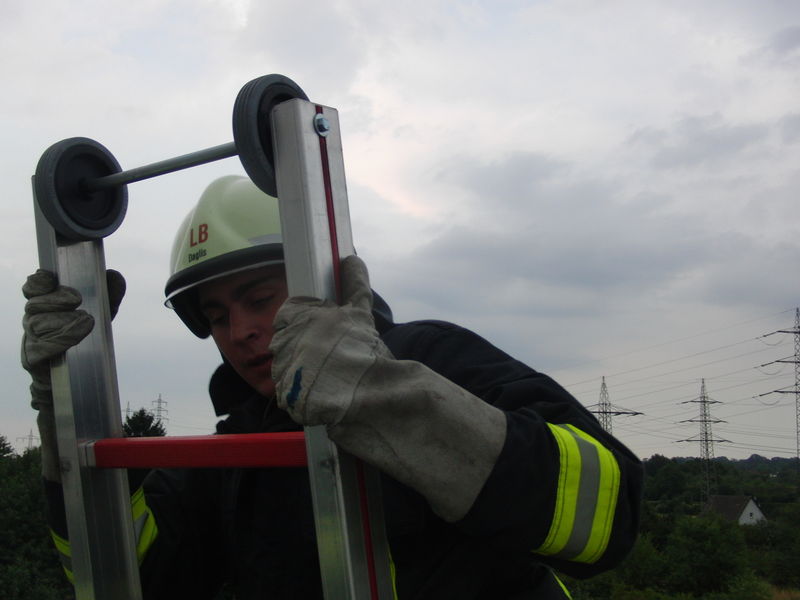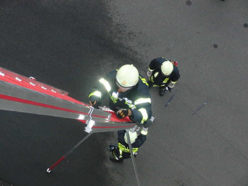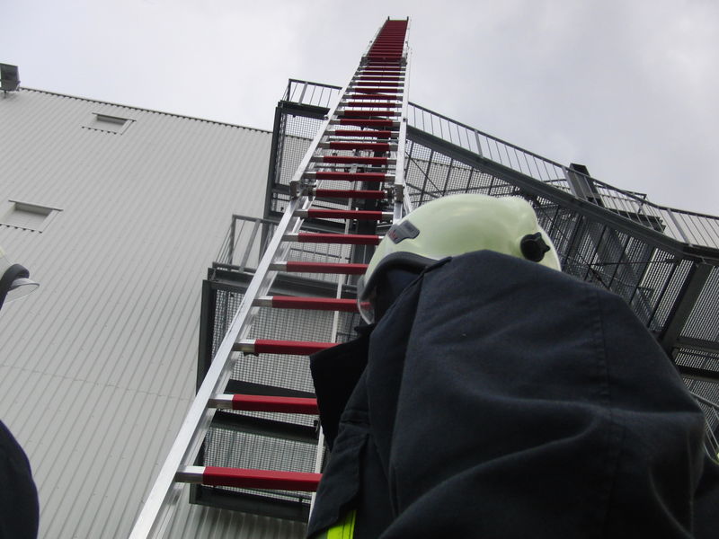 Schaulustige gibt es immer … und wenn es nur die eigenen Kameraden sind, die den anderen bei der Arbeit zuschauen.Auf dem Löschgruppenfahrzeug der Feuerwehr Libur finden sich drei verschiedene Leitern: Ein vierteiliger Satz mit Steckleiterteilen, eine dreiteilige Schiebleiter und eine kleine Teleskopleiter. Letztere stellt eher einen Sonderfall dar, für die Menschenrettung im Einsatz kommen mit großer Wahrscheinlichkeit die beiden vorgenannten Leitern zum Einsatz. Bevor eine Leiter in Stellung gebracht wird, gilt es, eine wichtige Frage zu klären: Welche Höhe muss erreicht werden? Die Steckleiterteile reichen bis zum zweiten Obergeschoss, die dreiteilige Schiebleiter kommt noch ein Geschoss weiter nach oben. Weiterhin sind die Vor- und Nachteile der beiden Leiter-Varianten zu bedenken: Die Schiebleiter ist schwer und benötigt viel Platz zur Aufstellung, die Steckleitern kann man durch sogenanntes „Unterbauen“ auch bei beengten Platzverhältnissen zum Einsatz bringen. Neben der nötigen Portion an Theorie haben wir unsere Kenntnisse beim Übungsdienst in die Praxis umgesetzt. Auf dem Gelände eines Möbellagers bot sich eine externe Rettungstreppe als Übungsobjekt an. Die