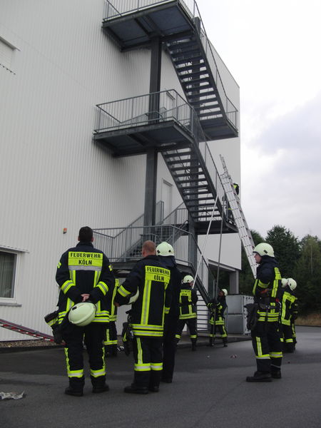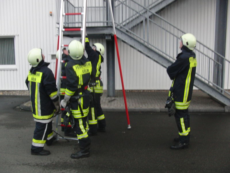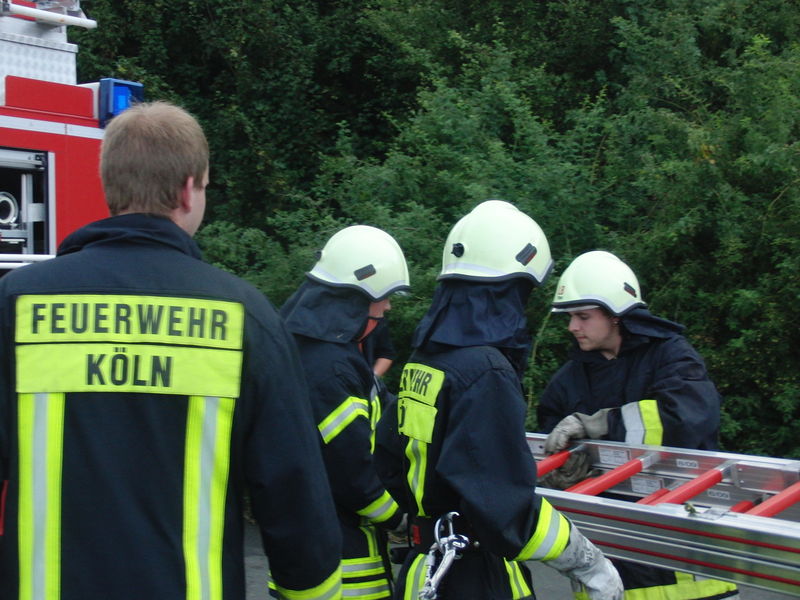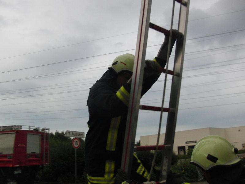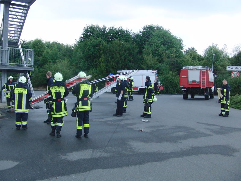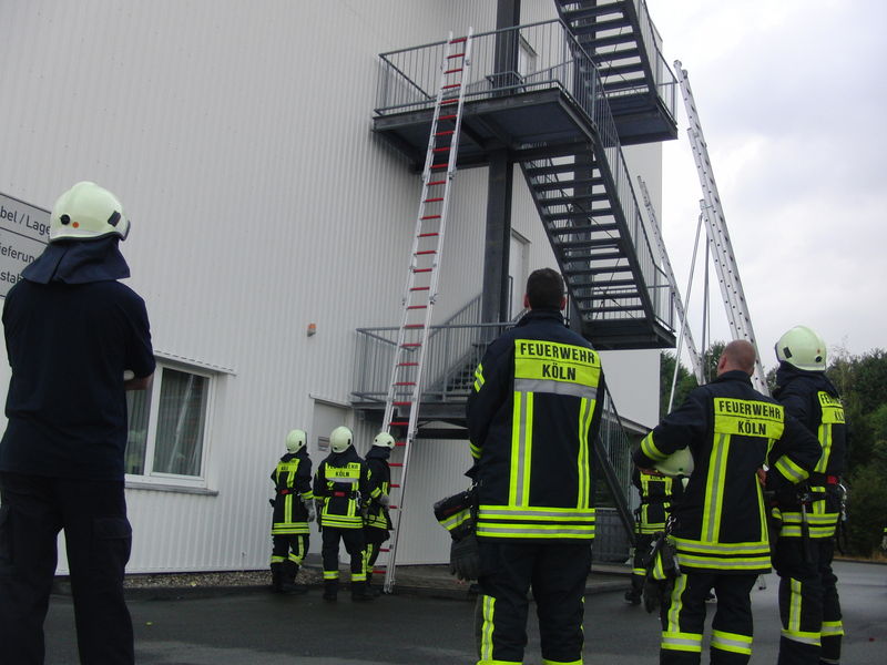 Löschgruppe Wahn war bei ihrem Übungsdienst offenbar auf die gleiche Idee gekommen, sodass rund um das Möbellager ein reger Feuerwehr-Betrieb herrschte, der – wie so oft – auch für ein paar neugierige Passanten sorgte. Einbinden von Geräten – auch das will geübt sein.