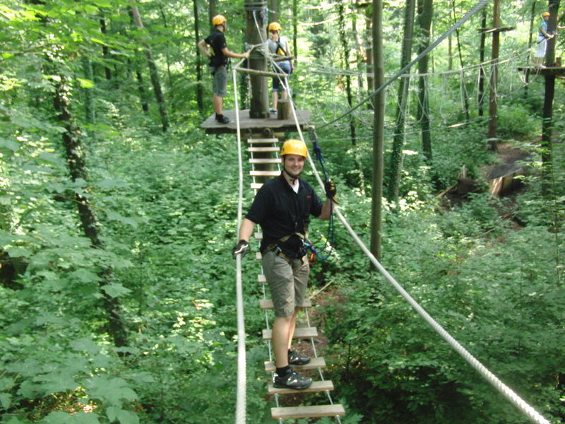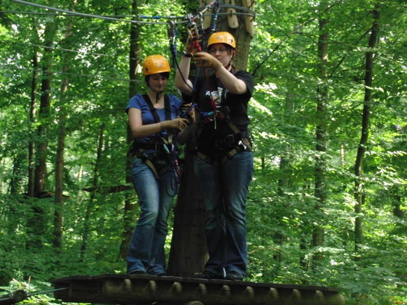 Kletterpark „Schwindelfrei Brühl“ hatte uns mit einem weiteren Anreiz gelockt: Man gewährte in den Sommerferien einen Rabatt für Mitglieder von sozialen Einrichtungen. Unsere Gruppe war für 14 Uhr angemeldet, wegen hoher Besucherzahlen mussten wir jedoch ein paar Minuten länger warten. Nach dem Anlegen der Sicherungsausrüstung erhielten wir eine Einführung, neben dem richtigen Sichern wurden wir so auch in die Benutzung der Seilrutsche eingewiesen. Kurze Pause in den Baumwipfeln: Sind die Kletterelemente belegt, muss man warten – ab dem dritten Parcours tut die Erholung dann auch gut.