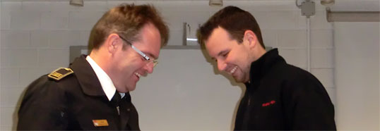 Am gestrigen Übungsabend hatte sich hoher Besuch angekündigt. Herr Peter Hartl, Leiter des Gefahrenabwehrbereiches Süd, und Herr Peter Christen, Sprecher FF des Bereichs Süd, kamen zur Stippvisite.Herr Hartl hatte dabei noch eine Beförderungs-Urkunde im Gepäck – Pascal Remarque wurde zum Oberbrandmeister befördert, nachdem er im Dezember 2009 die Ausbildung zum Gruppenführer absolviert und seine Standzeit als Brandmeister durchlaufen hat. Dazu gratulieren wir recht herzlich, Pascal!